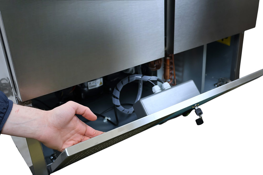 Urządzenie zostało wyposażone w wymuszony system chłodzenia, który utrzymuje stabilną temperaturę od +2°C do +8°C, gwarantując świeżość i bezpieczeństwo produktów spożywczych. Zastosowanie czynnika chłodniczego R290 zapewnia efektywną i energooszczędną pracę, a nowoczesny sterownik Dixell pozwala na precyzyjne zarządzanie temperaturą.